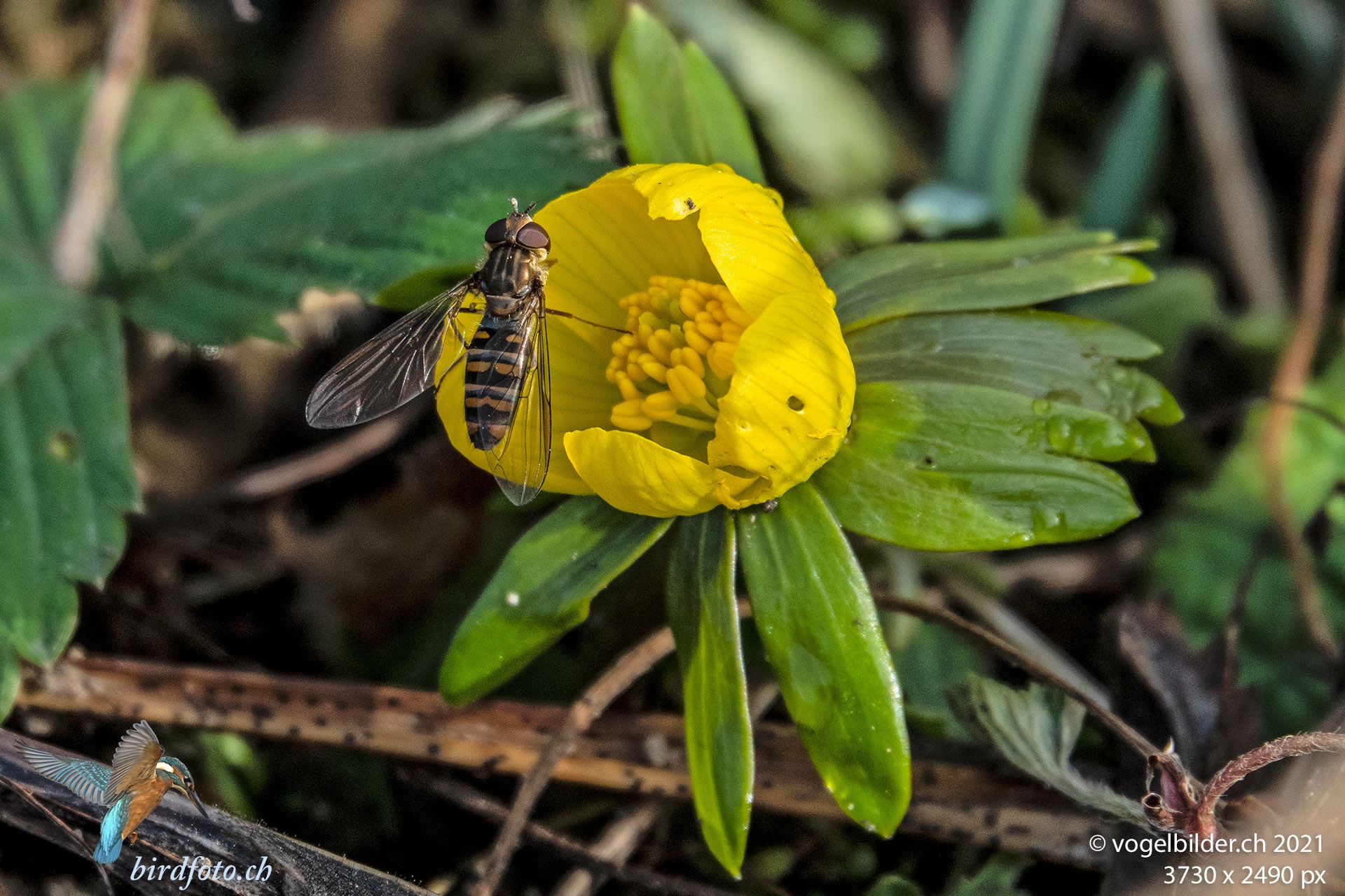 Die ersten warmen Frühlings-Sonnenstrahlen locken Schwebfliegen an die Winterlinge