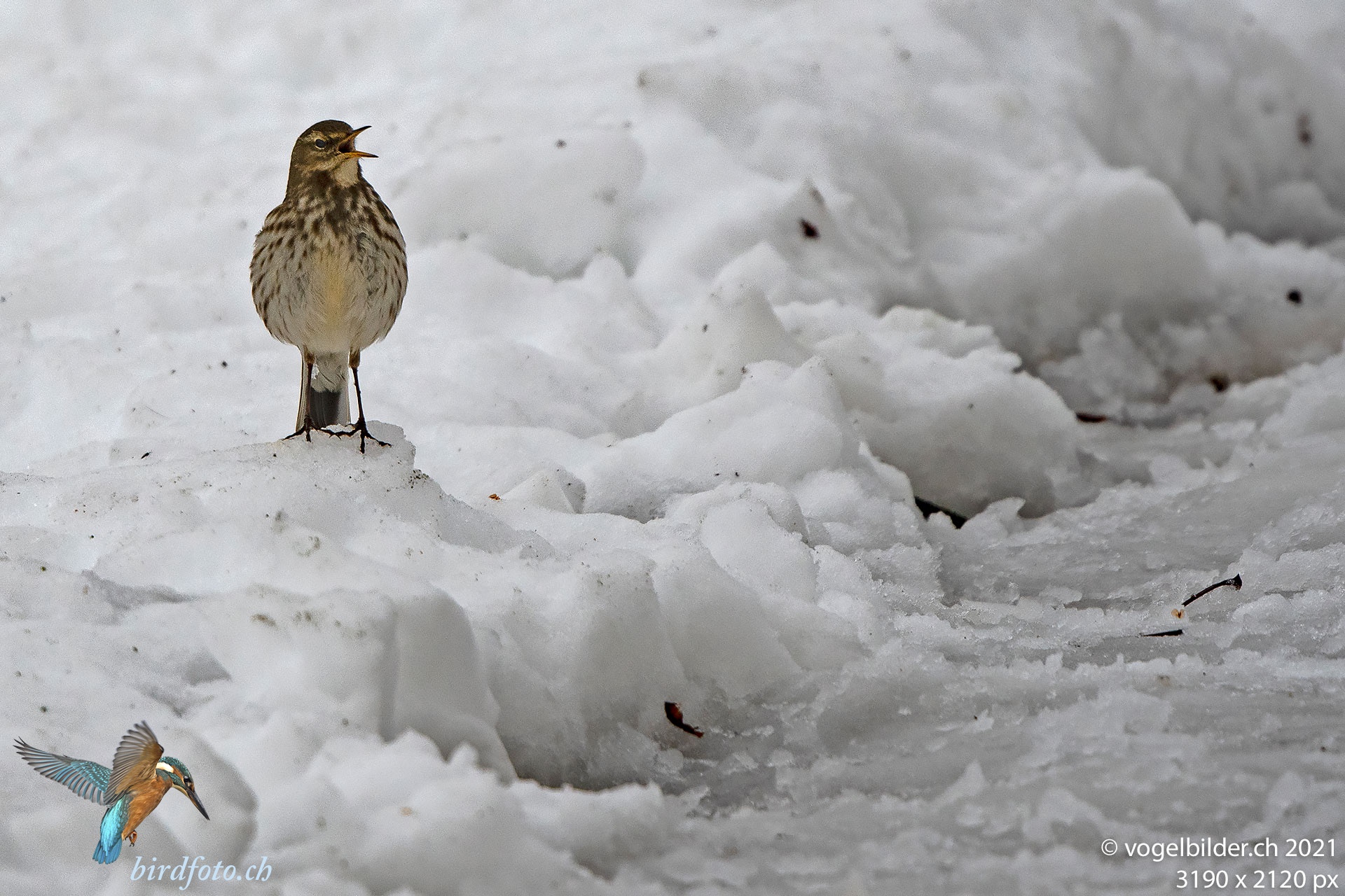 Entlang der Limmat suchen die Bergpieper mit Vorliebe auf dem Schnee nach Nahrung. Sie sind sehr scheu.