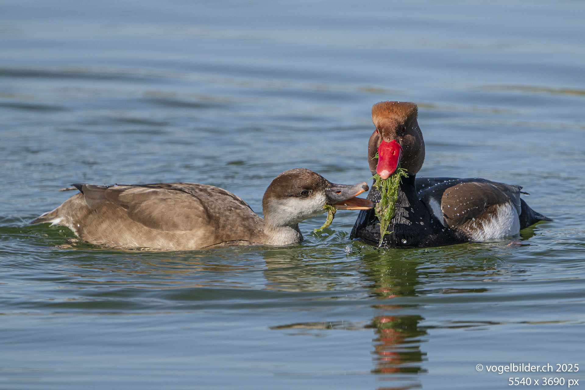 Etwa nach dem dritten gemeinsamen Tauchgang blieb das Weibchen oben. Als das Männchen mit vollem Schnabel wieder auftauchte, konnte sich das Weibchen an den sich im Schnabel befindlichen Wasserpflanzen bedienen, und das mehrmals.