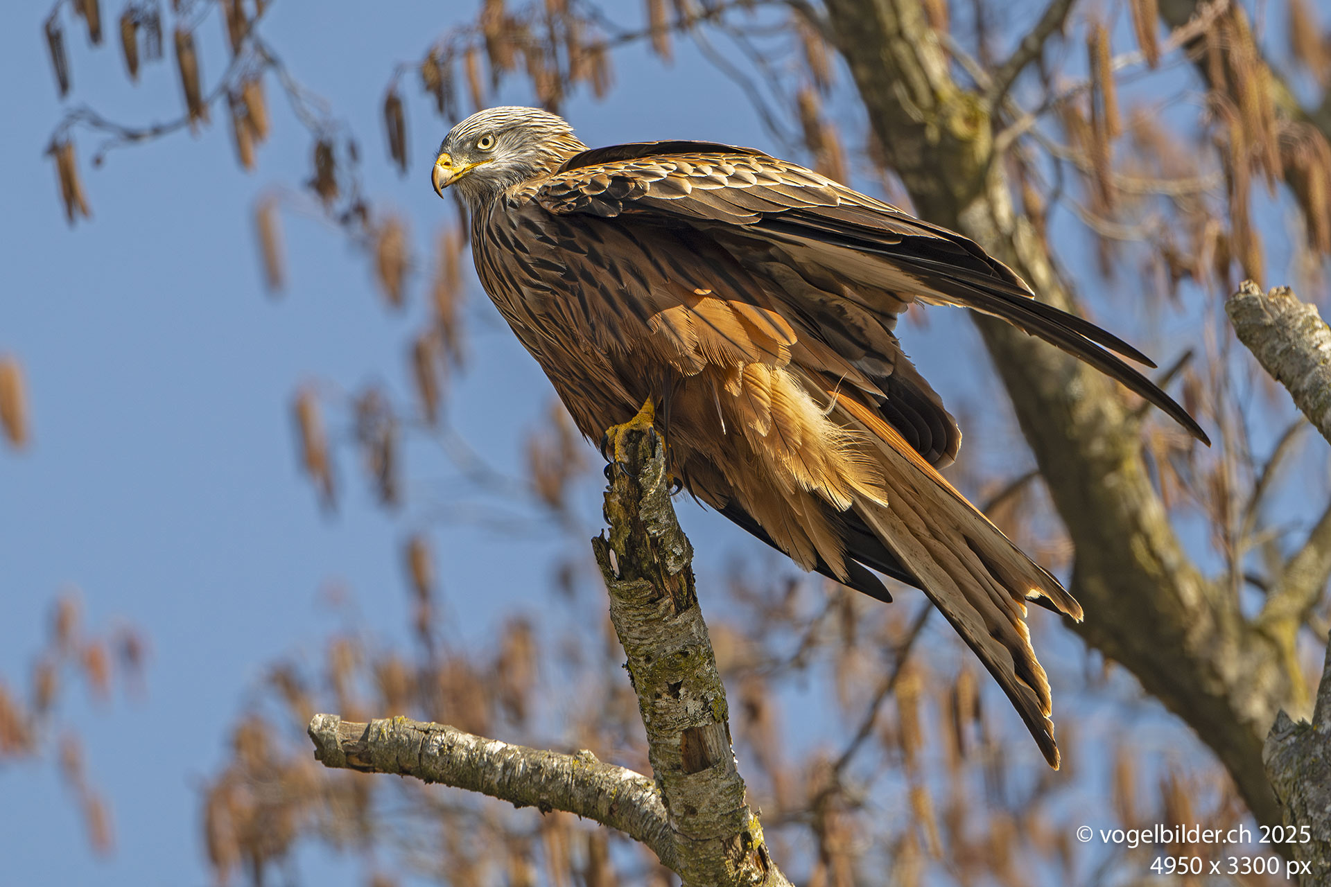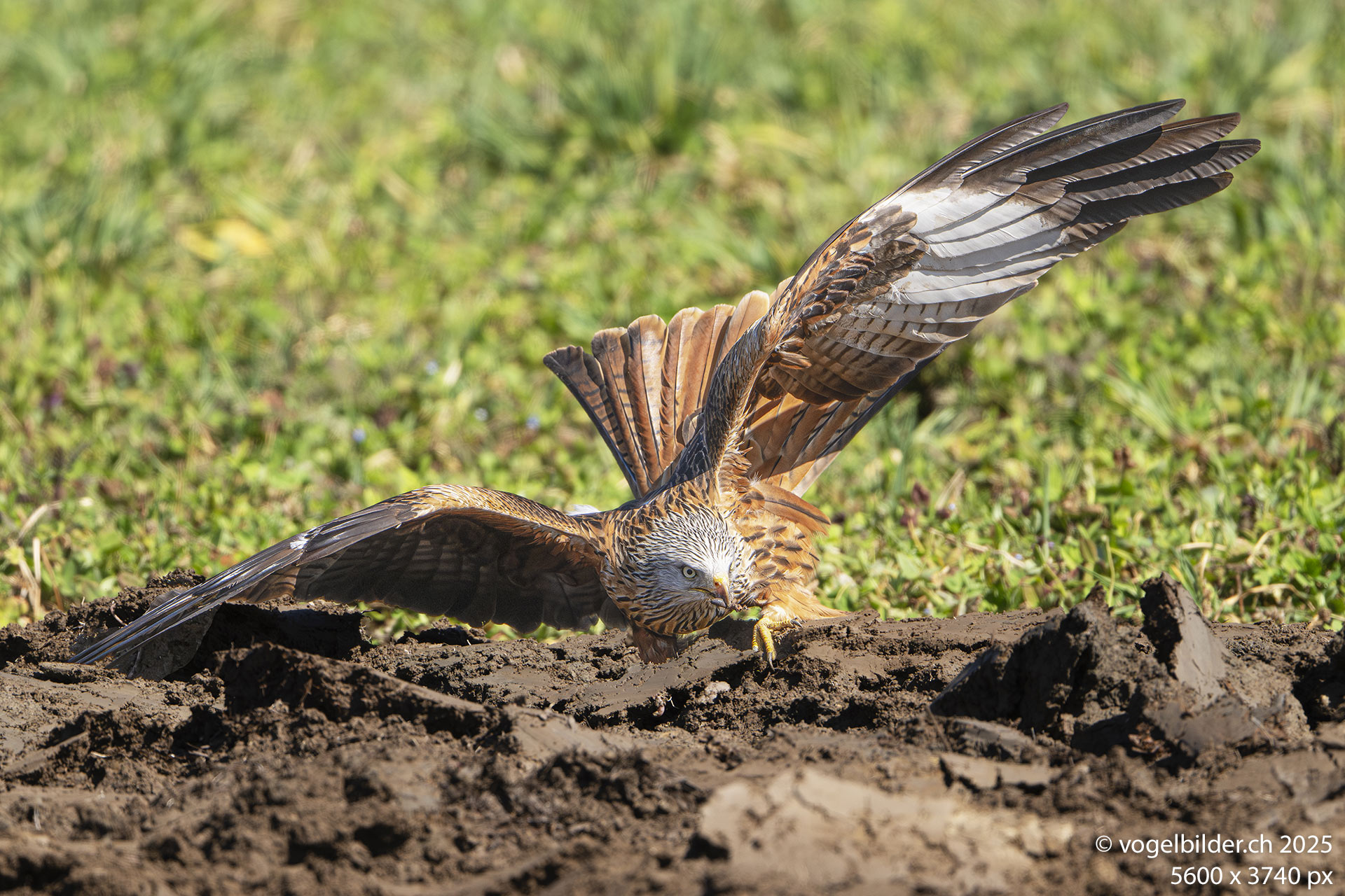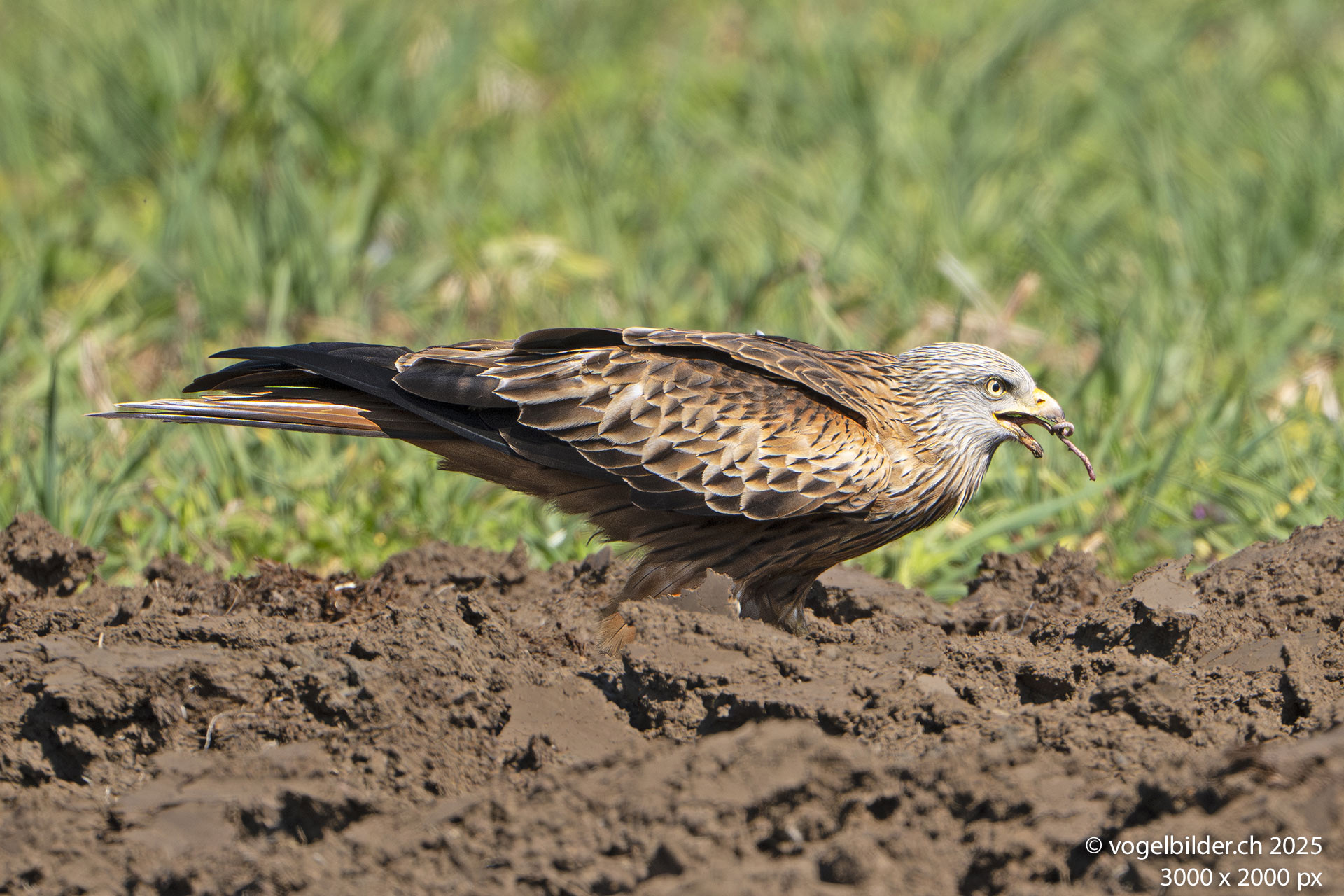 Als ein Traktor mit Pflug zu sehen war, hoffte ich bereits auf Fotosujets, denn das Umpflügen oder Mähen einer Fläche zieht immer vielerlei Nutzniesser an. Zunächst aber musste der Bauer seinen Pflug in Schwung bringen, was länger dauerte und ich ging weiter. Als er dann tatsächlich mit Pflügen begann, kehrte ich eilends zurück und wartete. Zuerst geschah nichts, aber dann kreiste ein Weissstorch über dem Acker, bald ein zweiter - aber nicht für lange, das schien uninteressant. Ich wartete. Dann kehrten die beiden Störche zurück und kurz darauf eine Gruppe Lachmöwen. Und dann tauchten die ersten Rotmilane auf. Und die machten dann richtig Show und vergnügten sich an den Regenwürmern, die der Pflug an die Oberfläche beförderte. Total waren es gegen 20 Rotmilane, die sich einen - wenn auch kleinen - Happen schnappten, und auch vor einem schmutzigen Schnabel nicht zurückschreckten.